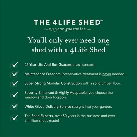 This wooden shed is pressure treated to prevent rot and backed by an unbeatable 25-year anti-rot guarantee, which is the longest guarantee on the market. The wood will never need retreating, saving time and money. You’ll only ever need one shed with a 4Life™ Shed!