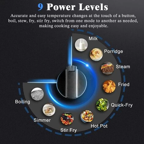 - 🥘【Knob Control】Easy to operate and use with no complicated button controls. Prevent children or family pets from accidentally touching the switch button; swap between 9 adjustable levels of heat, whether you’re frying, deep frying, stir-frying, roasting, or boiling (Included detailed manual)