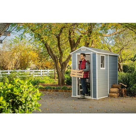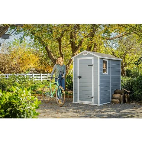Always room for storage. The attractive Manor 4×6 is a narrow and extremely durable storage shed designed to fit right into that small space alongside your home. Made of innovative lightweight panels “H” shaped, double- wall structure constructed to provide extra strength to withstand heavy duty weather and are built to last. The Manor 4×6 is a maintenance- free shed, no varnish or paint is needed. It features integral floor panel and ventilation that keeps your stored items clean and dry, a fixed window for lots of natural light and is lockable for extra safety and secure.