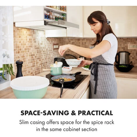 Versatile, powerful and incredibly compact: the Klarstein Mariana 60 flat screen hood with a smart pull-out mechanism ensures a haze-free kitchen at all times.